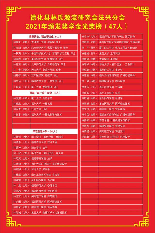 中华文化报讯(林良令 通讯员林扬能 林炳炜)2021年8月18日,德化县林氏源流研究会法兴分会,在德化县盖德镇宴林口狮子祖世紫堂,举行2021年度优秀学子奖学金发放仪式。本次获得奖励的优秀学子48人,研究会各理事成员、各村党支部书记、村主任、优秀学子及家长参加了颁奖仪式。