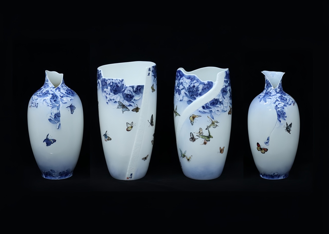 而釉上五彩的点缀,则为作品注入灵动之气。在烧制完成的釉面上,她以细腻笔触描绘蜻蜓、蝴蝶等生灵,色彩斑斓的翅膀、栩栩如生的体态,经低温二次烧制后色彩固定,仿佛下一秒便会振翅飞走。这种艳丽鲜活的色彩与青花的淡雅、雕刻的厚重形成巧妙对比,达成“动静相宜、刚柔并济”的艺术效果。