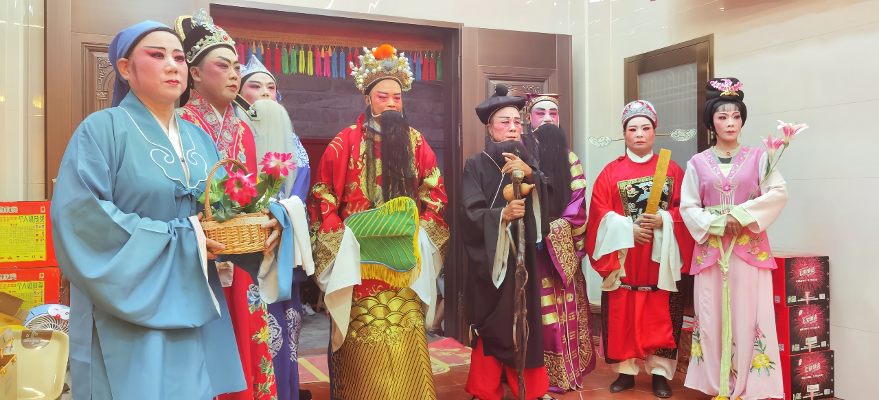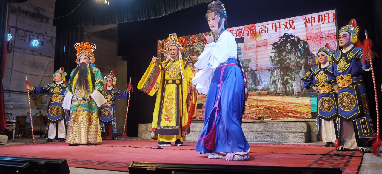 晚七点整,伴随着激昂的锣鼓声,高甲戏《八仙贺寿》经典桥段拉开庆典序幕。戏班演员身着绣金戏服,分别扮演吕洞宾、铁拐李等八仙角色,手持法宝缓步走入马明尊王殿。“仙童献寿”“八仙拜坛” 等程式化表演引得满堂喝彩,不少老年村民跟着哼唱台词,重温儿时记忆。据了解,这种以传统戏曲祝寿的形式,在闽南“佛生日”庆典中延续已久,既是对护境神明的感恩,也是地方戏种传承的重要载体。